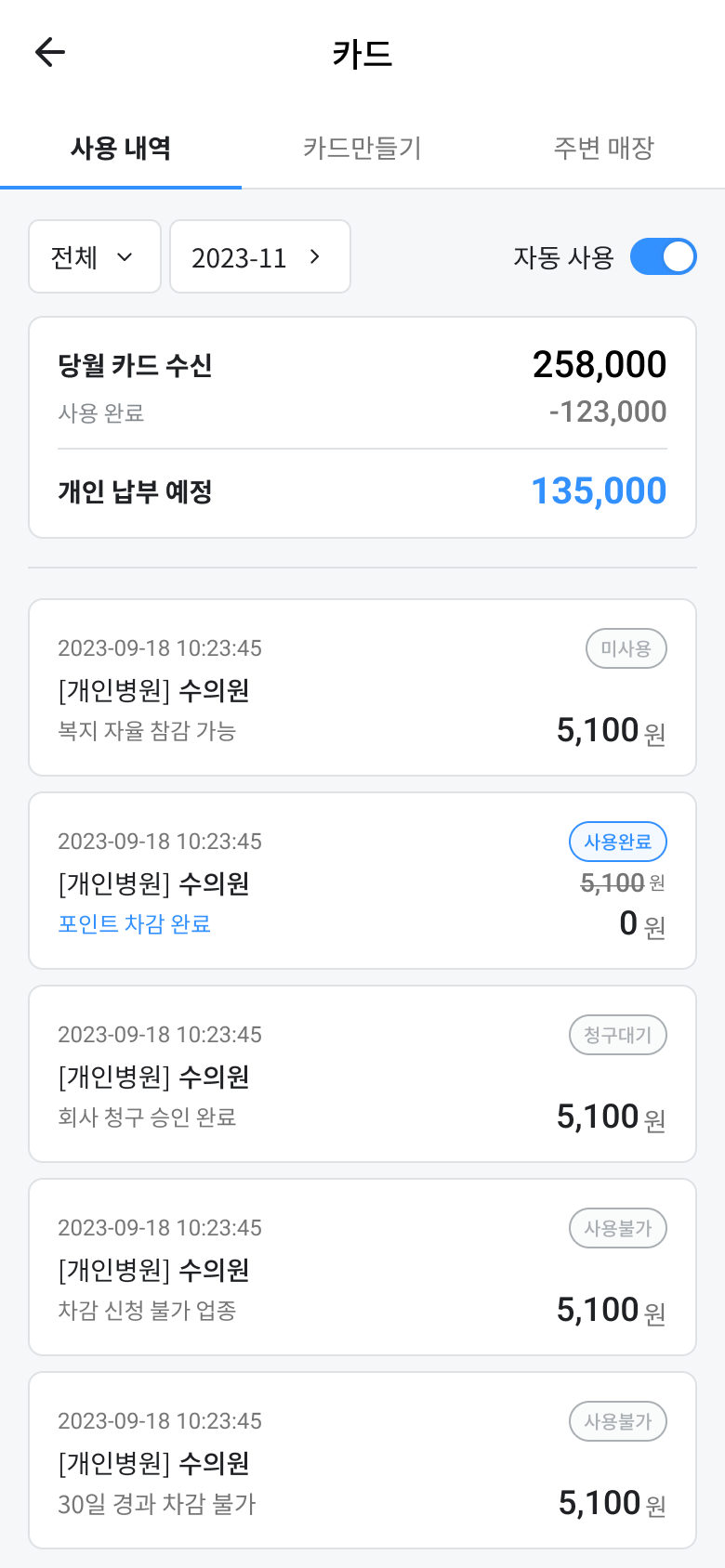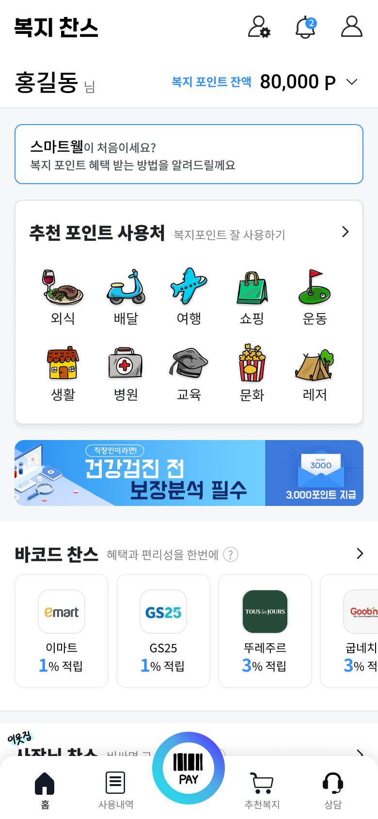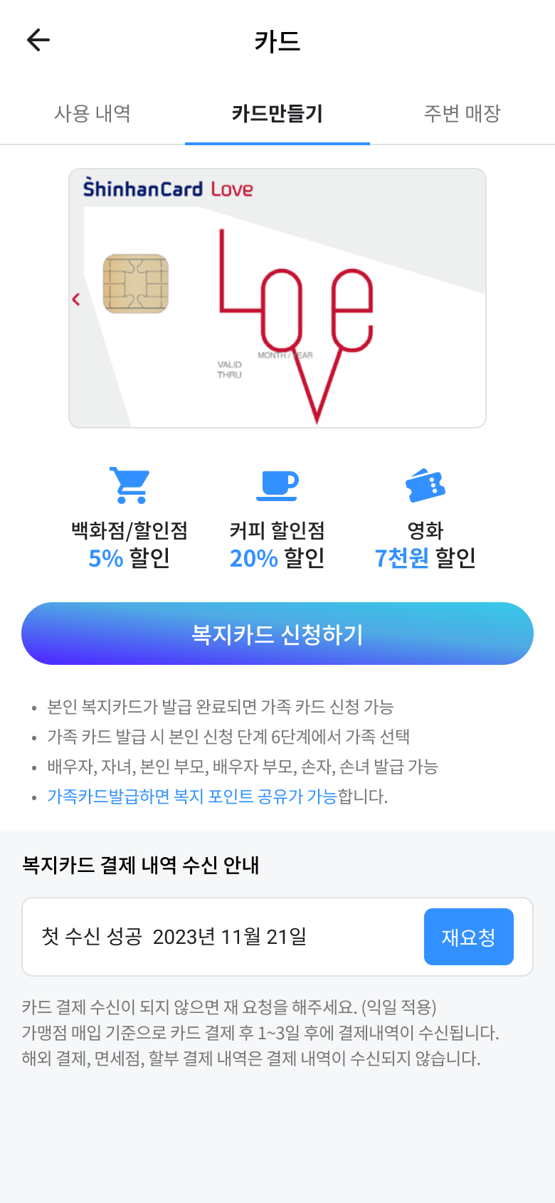 앱 설치 모바일 신청 내역 수신 차감 & 청구 가맹점 앱만 설치하면 끝 앱 설치 후 휴대폰 본인 인증만 하면 이용 가능합니다. 모바일로 간편하게 복지카드 신청 복지 신용카드, 복지 체크카드 모두 앱으로 간편하게 발급 받을 수 있습니다. 결제 내역 수신 사용 내역은 다음날 앱에 자동 수신 됩니다. (단, 할부 거래, 해외 사용은 수신되지 않습니다) 포인트 차감 & 회사 청구 결제 대금 포인트 차감, 회사 청구 하실 수 있으며, 차감 또는 청구 승인된 금액은 결제 대금에서 제외됩니다. 가맹점 현황 간편하고 스마트한 복지찬스 앱을 만나보세요! 주변 가맹점 안내 잔여 포인트를 사용할 수 있는 주변 가맹점을 미리 안내해 드립니다. 복지항목 카드업종명 가맹점명 매출 881억 9,727만원 가맹점 수 307,487개 건수 3,080,376건 복지 항목 카드 업종명 가맹점명 주소 방문 횟수 누적 매출 데이터를 불러오는 중입니다. APP 이용 가이드 보기 간편하고 스마트한 복지찬스 앱을 만나보세요!